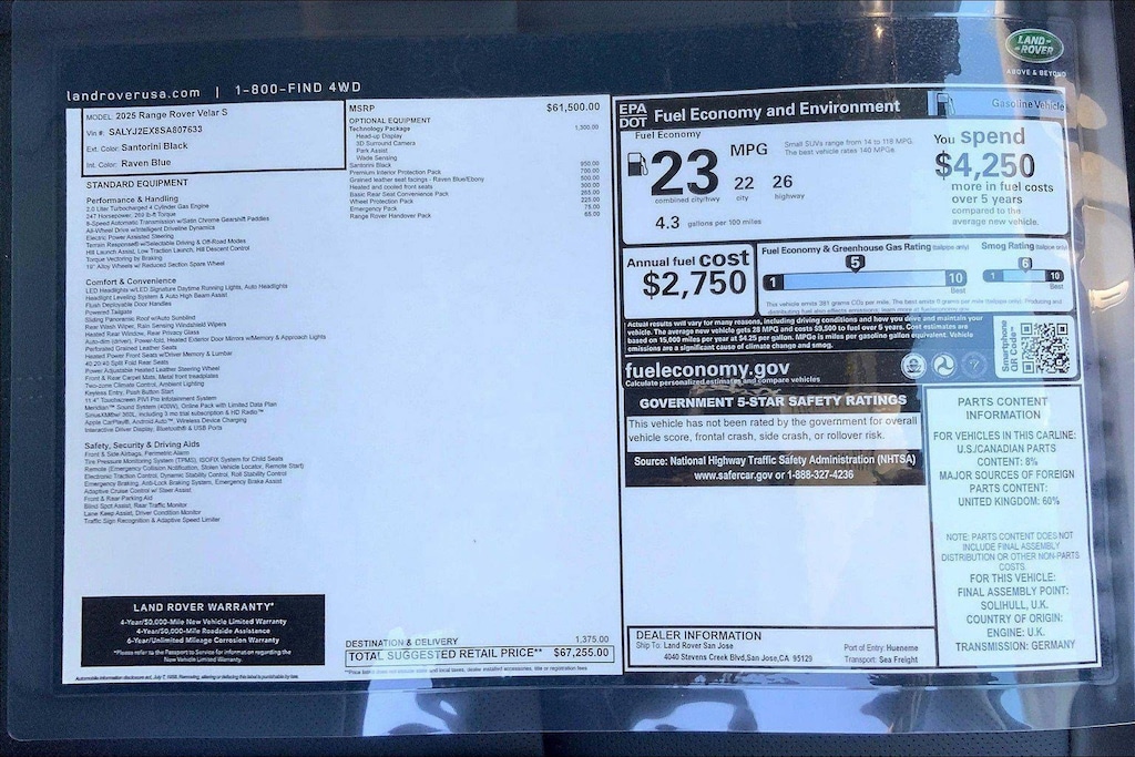 Plus government fees and taxes, any finance charges, any dealer document processing charge ($85), any electronic filing charge, and any emission testing charge. Any new Land Rover vehicle prices include a destination charge.
