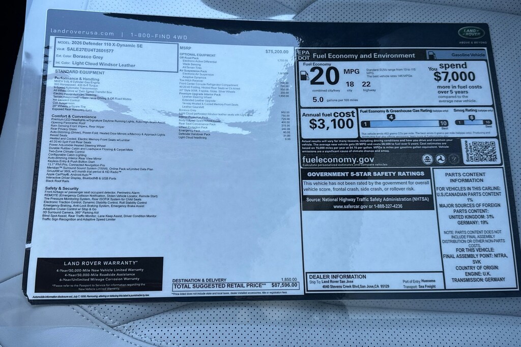 Plus government fees and taxes, any finance charges, any dealer document processing charge ($85), any electronic filing charge, and any emission testing charge. Any new Land Rover vehicle prices include a destination charge.