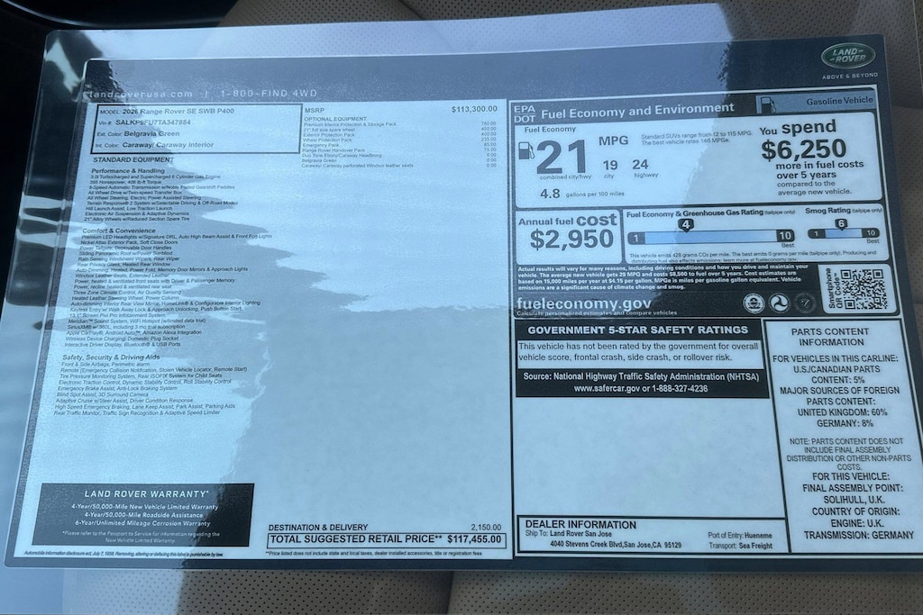 Plus government fees and taxes, any finance charges, any dealer document processing charge ($85), any electronic filing charge, and any emission testing charge. Any new Land Rover vehicle prices include a destination charge.