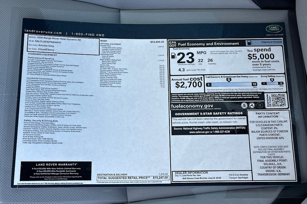 Plus government fees and taxes, any finance charges, any dealer document processing charge ($85), any electronic filing charge, and any emission testing charge. Any new Land Rover vehicle prices include a destination charge.
